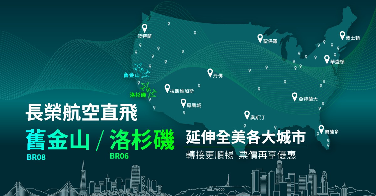 來往於美國內陸各大城市,長榮航空給您更經濟實惠的選擇!即日起至2026年2月28日,凡開立長榮航空運營之LAX BR06航班並延伸至美國內陸航點之機票,可享優惠票價。
