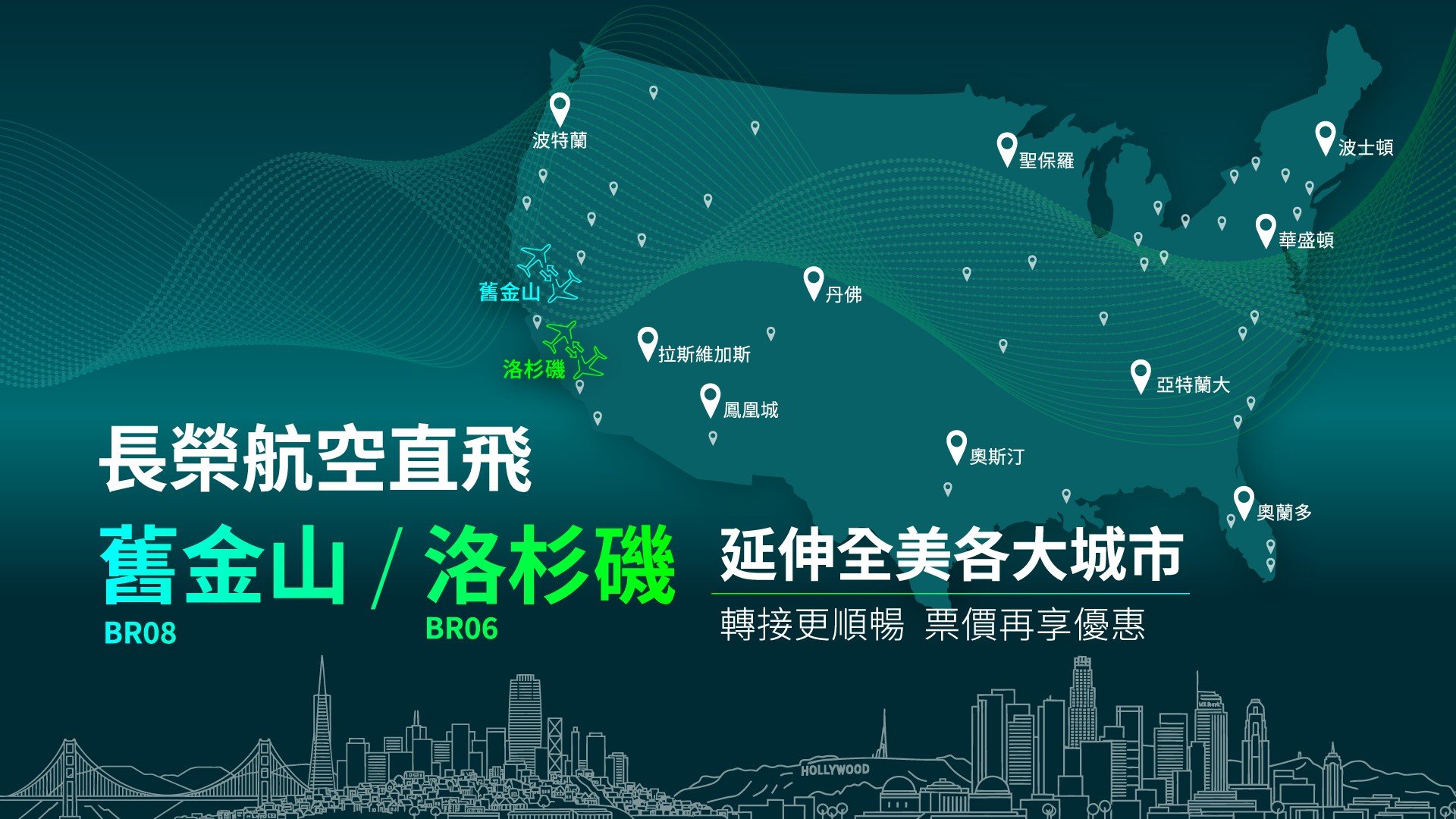 即日起至2026年2月28日,凡開立長榮航空運營之LAX BR06或SFO BR08航班並延伸至美國內陸航點之機票,可享優惠票價。